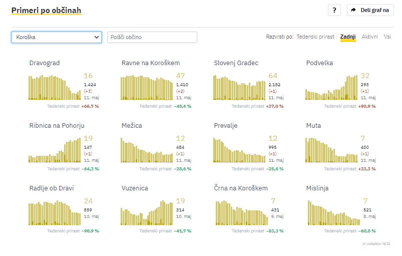 Dravograd 3, Ravne na Koroškem 2, Slovenj Gradec 1, Podvelka 1, Ribnica na Pohorju 1, Mežica 1, Prevalje 1, Muta 1.