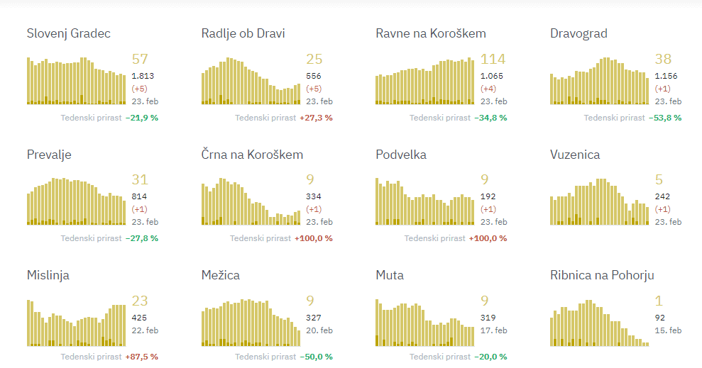 Slovenj Gradec 5, Radlje ob Dravi 5, Ravne na Koroškem 4, Dravograd 1, Prevalje 1, Črna na Koroškem 1, Podvelka 1, Vuzenica.