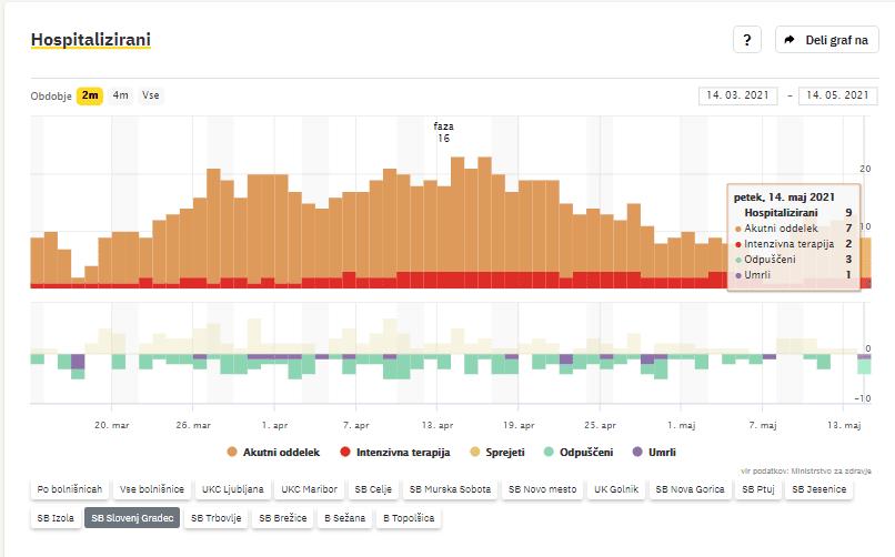 V Splošni bolnišnici Slovenj Gradec se po zadnjih podatkih Covid-19 sledilnika zdravi 9 covidnih bolnikov, dva na oddelku intenzivne terapije. V domačo oskrbo odpustili tri osebe. Ena oseba je umrla.