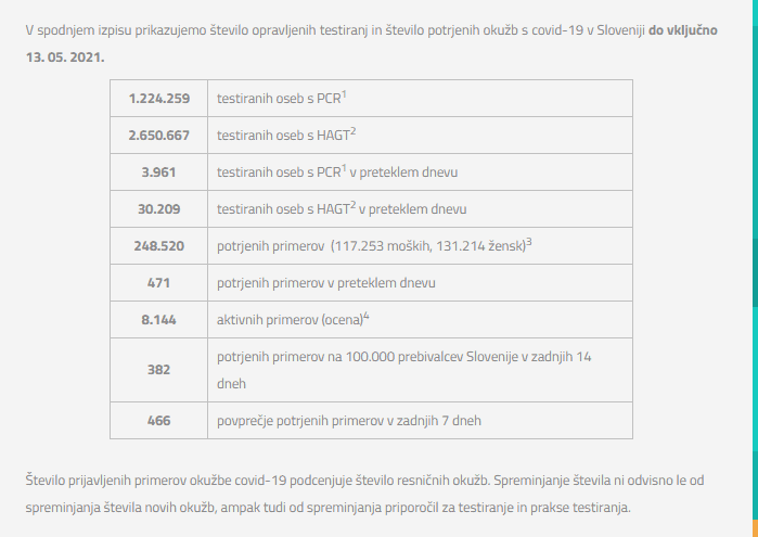 Število opravljenih testiranj in število potrjenih okužb s covidom-19 do vključno 13. 5. 2021: