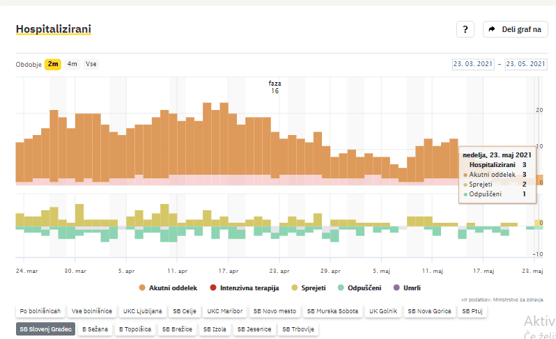 V Splošni bolnici Slovenj Gradec se po zadnjih podatkih Covid-19 sledilnika zdravijo trije covidni pacienti, vsi na akutnem oddelku. V bolnišnico so sprejeli dva nova pacienta, v domačo oskrbo so odpustili enega bolnika. Umrl ni nihče.
