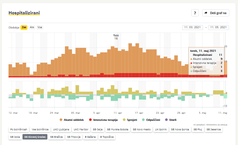 V bolnišnicah se zdravi 477 covidnih bolnikov, od tega 131 na intenzivni negi. Iz bolnišnic so odpustili 54 bolnikov, trije so umrli. Ker je sedemdnevno povprečje padlo pod 600, število hospitaliziranih pa pod 500, Slovenija izpolnjuje pogoje za prehod v rumeno fazo sproščanja epidemioloških ukrepov.