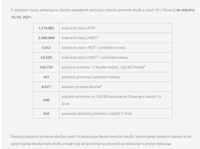 Število opravljenih testiranj in število potrjenih okužb s covidom-19 do vključno 10. 5. 2021: