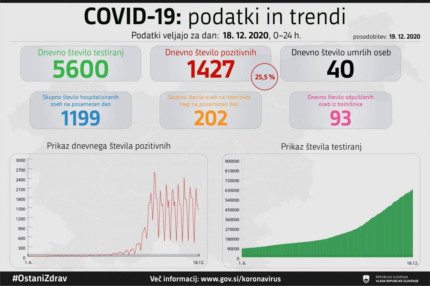 Trend obolelosti s koronavirusom v Sloveniji na dan 18. 12. 2020 (00:00-24:00):