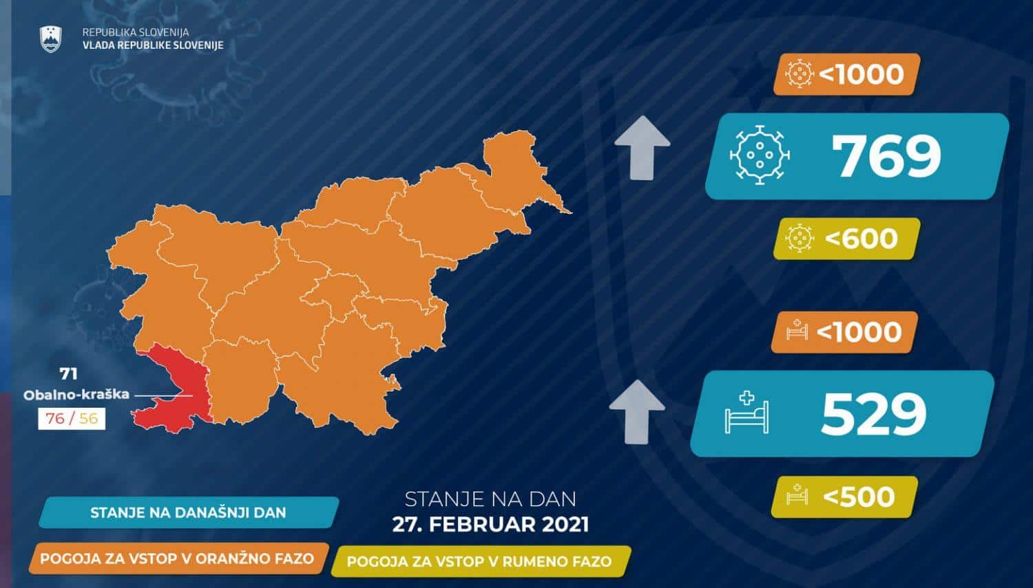 Oba podatka državo še vedno uvrščata v oranžno fazo sproščanja ukrepov. Za prehod v rumeno fazo bi sedemdnevno povprečje okužb moralo pasti pod 600, število hospitaliziranih pa pod 500.