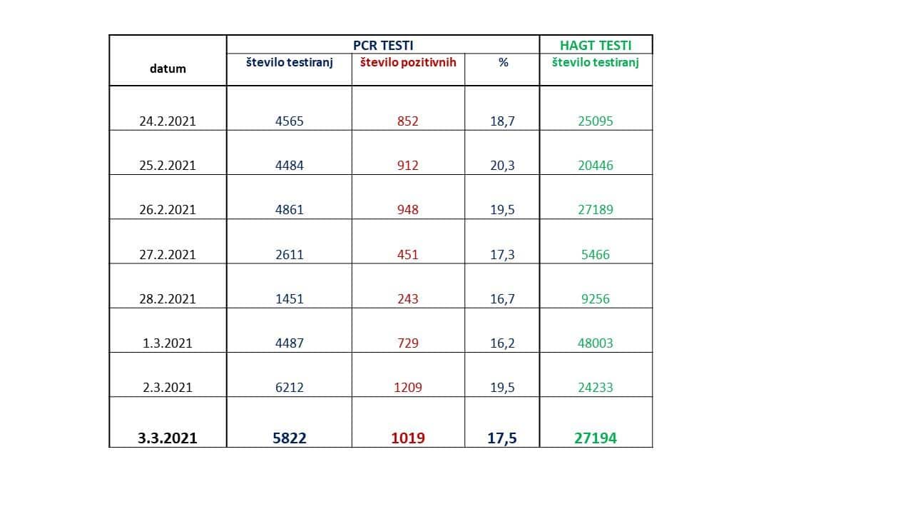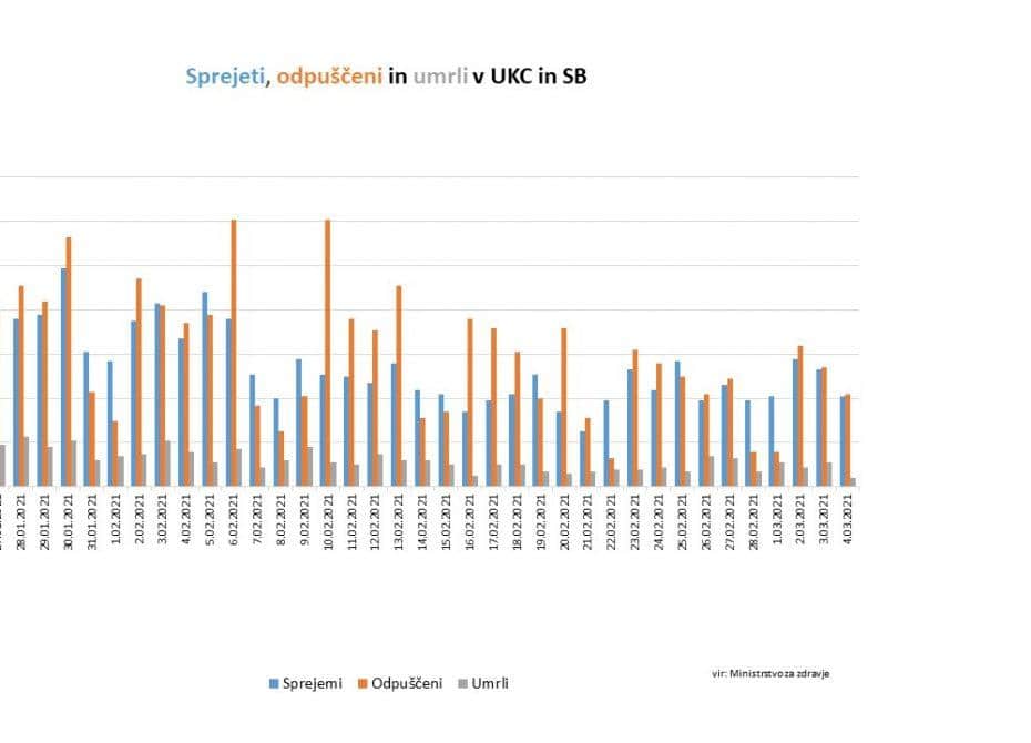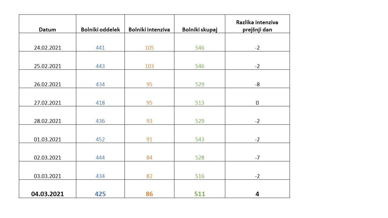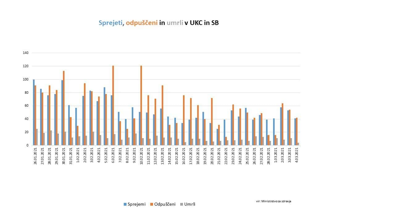 Danes se v bolnišnicah zdravi 511 pacientov, 5 manj kot včeraj. Na intenzivni terapiji se zdravi 86 pacientov, 4 več kot včeraj. Včeraj je bilo v bolnišnice sprejetih 41, odpuščenih pa 42 pacientov. V bolnišnicah so umrle 4 osebe, je še pojasnila.