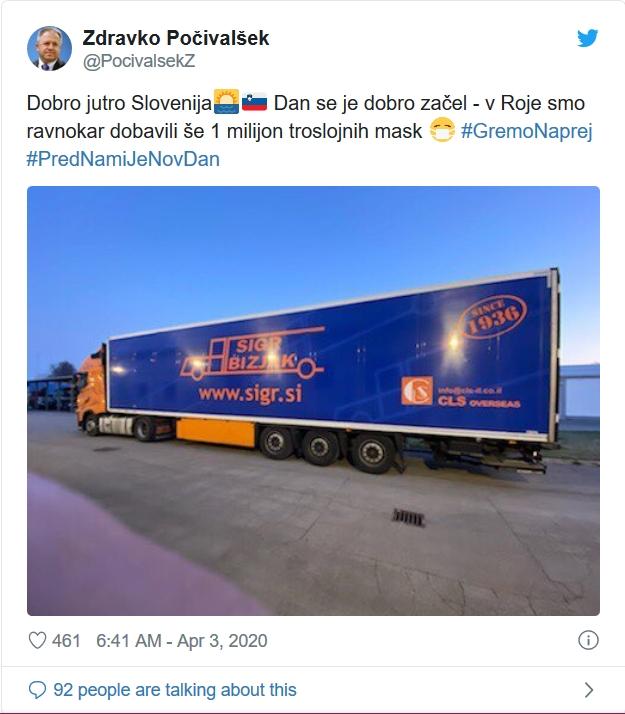 Gospodarski minister Zdravko Počivalšek je včeraj na Twitterju sporočil, da je zjutraj v skladišče Civilne zaščite v Rojah milijon troslojnih zaščitnih mask, že predvčerajšnjim pa je prav tako s tvitom javnost obvestil tudi o dostavi 19.500 mask FFP2.