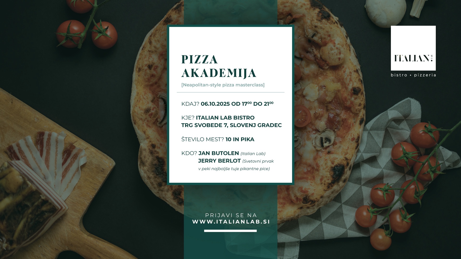 Pizza Akademija je enodnevna kulinarična delavnica, ki bo potekala 6. oktobra 2025, od 17:00 do 21:00, v Italian Lab bistroju v središču Slovenj Gradca. Skupaj z Jerryjem Berlotom – nagrajenim pizzaiolom, boste pod Janovim vodstvom (ja, Jan Butolen) spoznali vse faze priprave najboljše pice – od testa do peke v specializiranih pečeh.