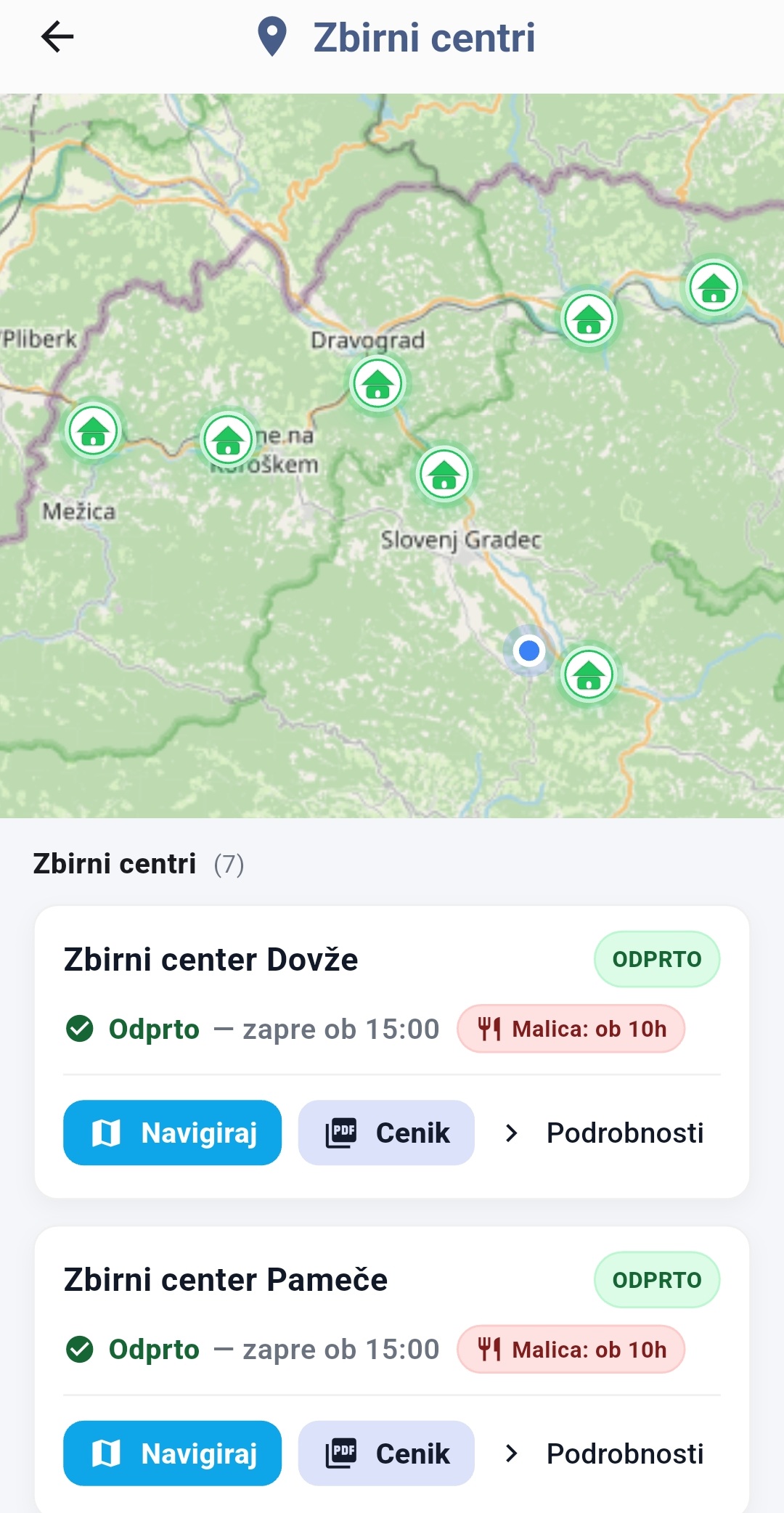 - lokacije zbirnih centrov z navigacijo, kjer najdete tudi delovni čas posameznega zbirnega centra,