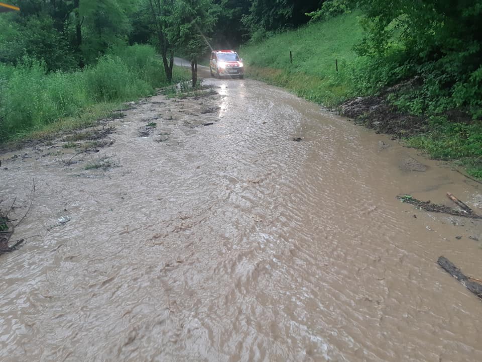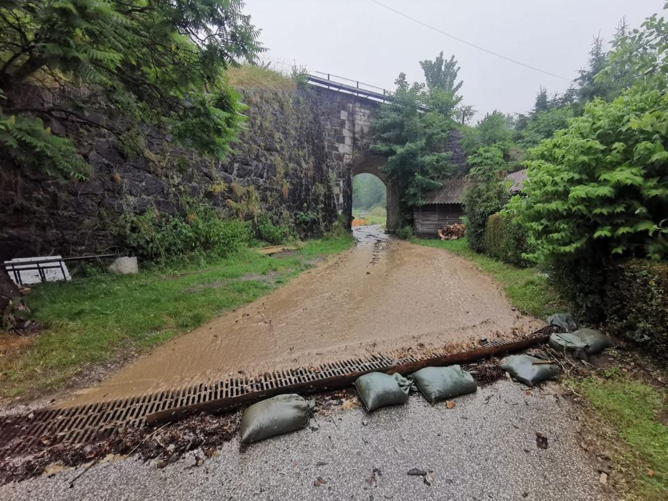 Ob 11.35 je na Partizanski cesti v Mežici meteorna voda ogrožala stanovanjsko hišo. S protipoplavnimi vrečami so jo zaščitili gasilci PGD Mežica.
