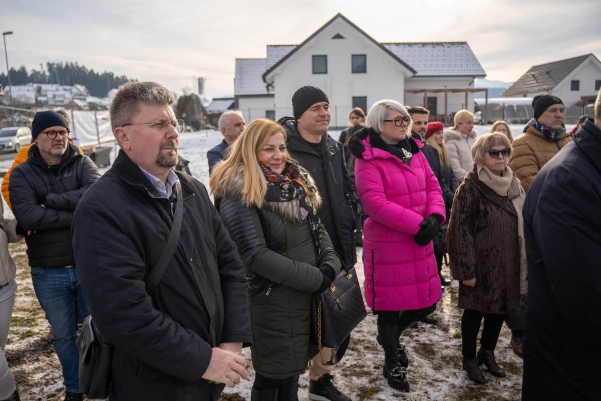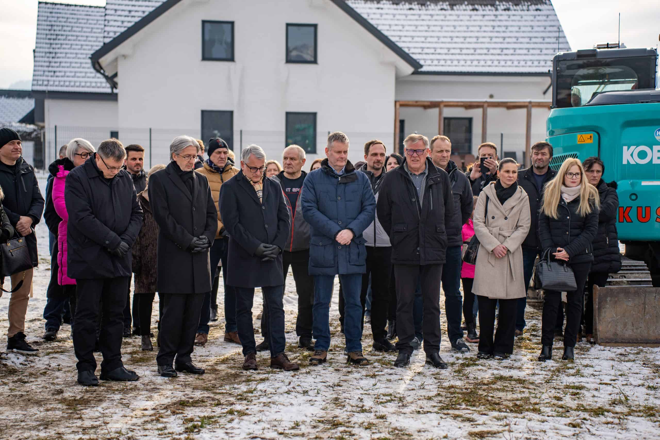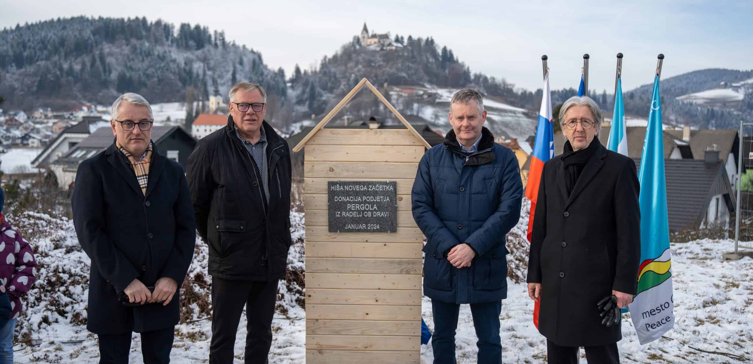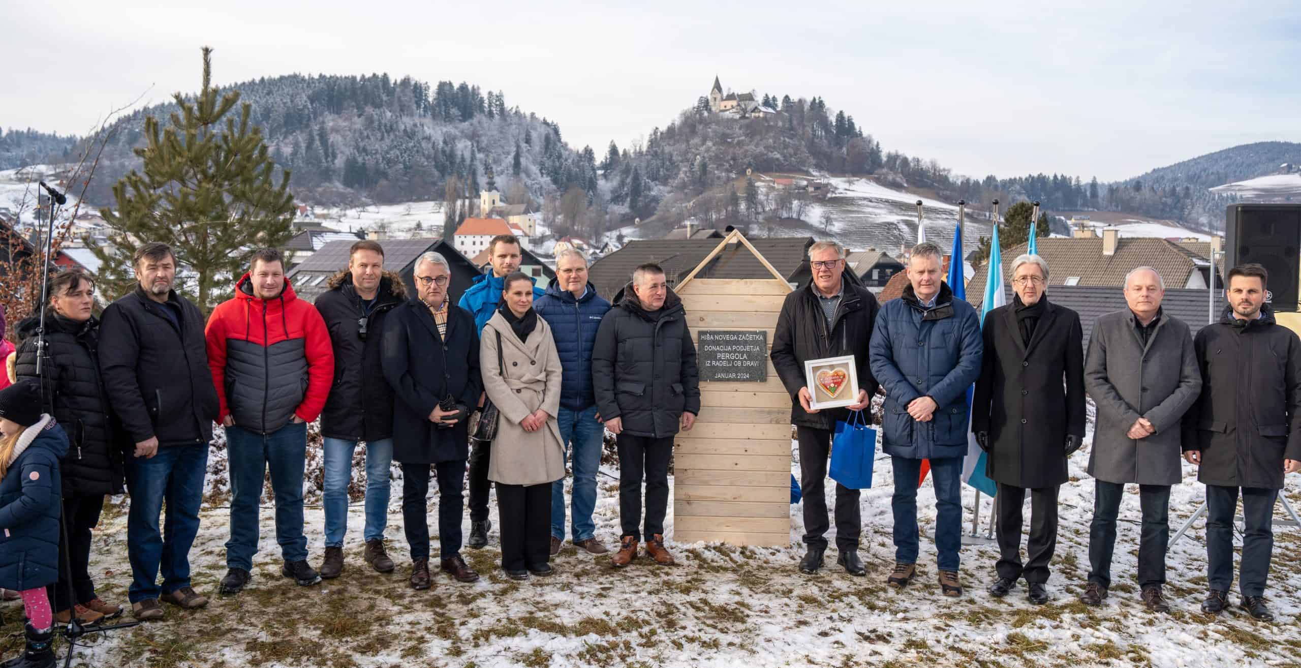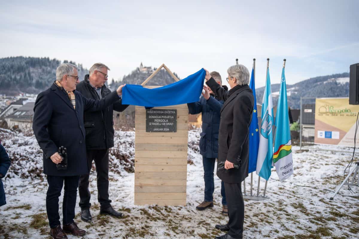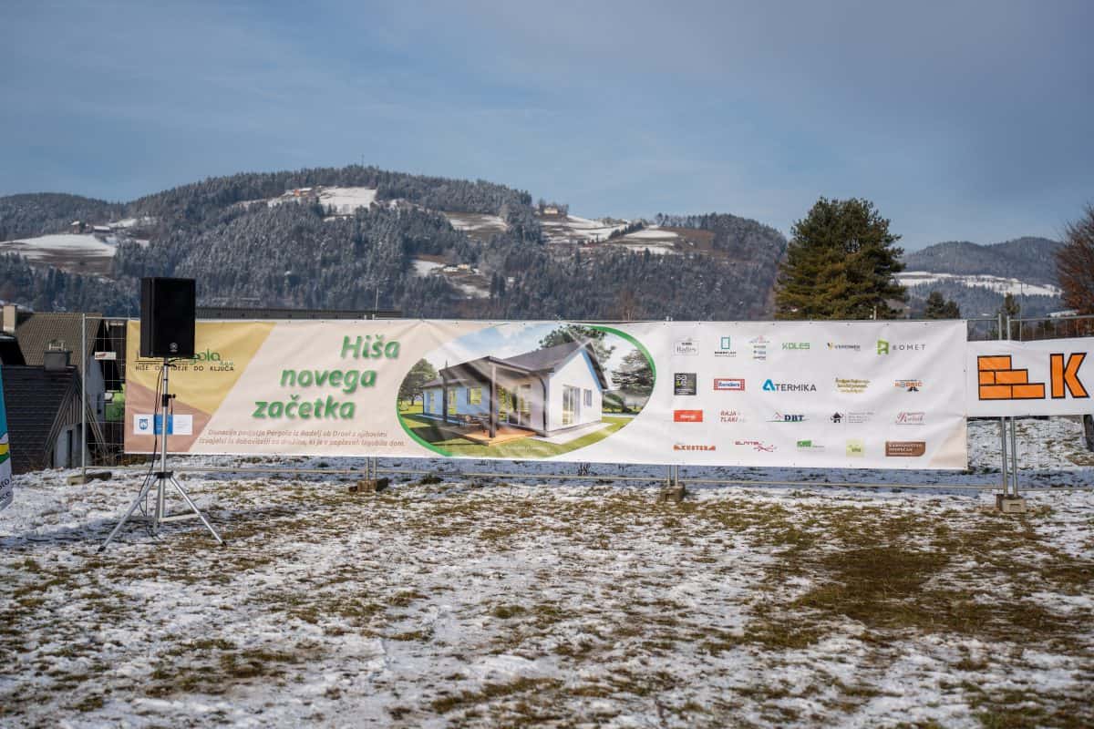Temeljni kamen za pritlično montažno hišo so položili Vidko Švajger, direktor podjetja Pergola d.o.o. iz Radelj ob Dravi, ki je hišo doniralo skupaj s številnimi izvajalci in dobavitelji, Tilen Klugler, župan MO Slovenj Gradec (občina je prispevala zemljišče), Matjaž Han, minister za gospodarstvo, turizem in šport ter Boštjan Šefic, državni sekretar za koordinacijo ukrepov in aktivnosti za obnovo po poplavah 2023.