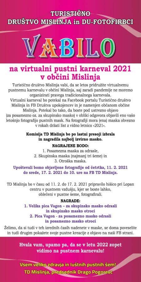 Turistično društvo Mislinja vabi, da se virtualnemu karnevalu pridružite na Facebook strani njihovega društva in Društva upokojencev. Želijo si, da si nadenete maske, se doma poveselite in svoje kreacije pokažete tudi ostalim občankam in občanom. Pod ustrezno objavo na Facebook strani boste nato svoje pustne fotografije delili z ostalimi, najbolj izvirne maske bodo tudi nagrajene.