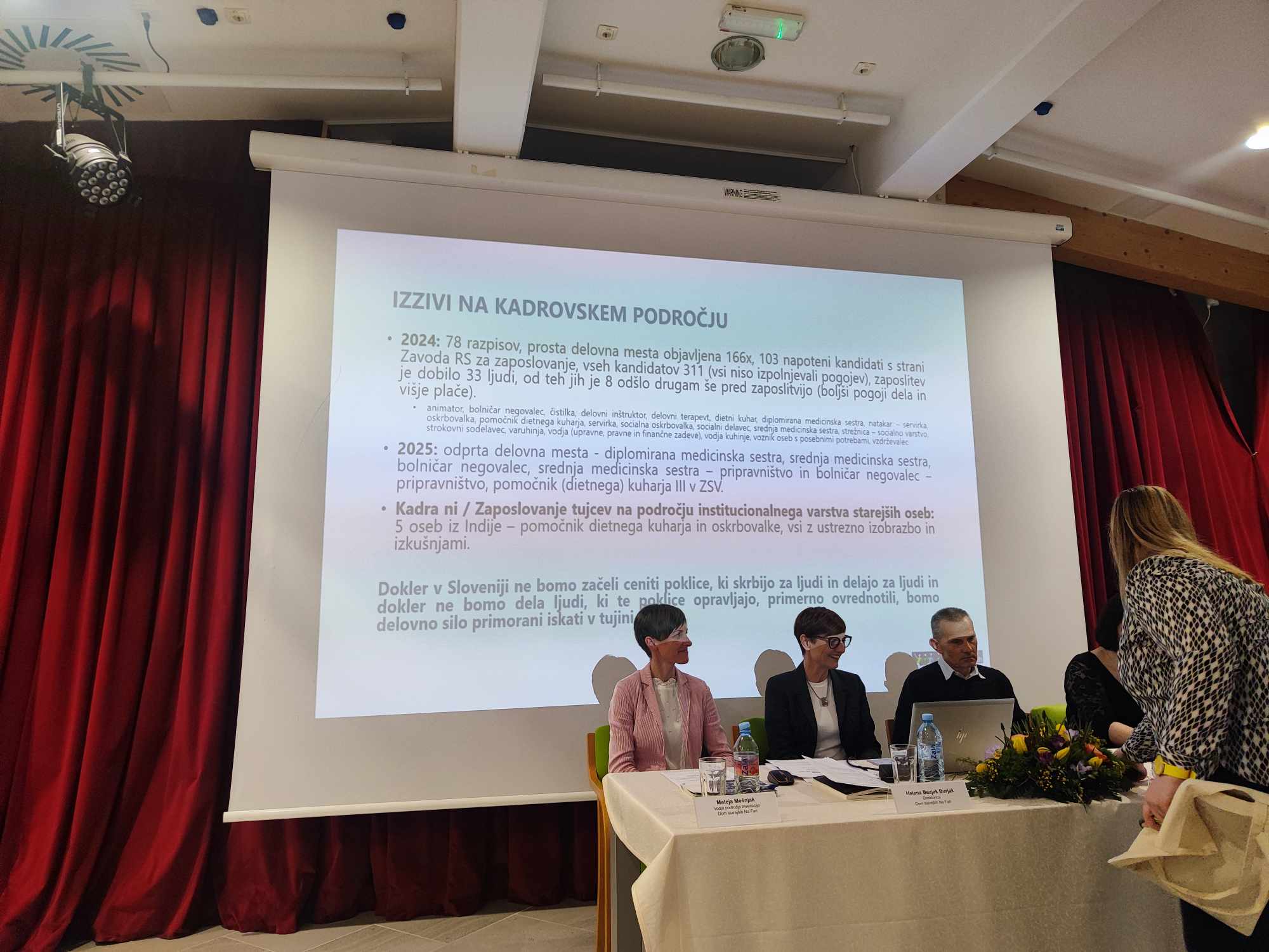 Temu pritrjuje kadrovska slika Doma v preteklem in letošnjem letu. Lani so objavili 78 razpisov za prosta delovna mesta, štirje so bili podaljšani iz leta 2023. Prosta delovna mesta so bila objavljena 166-krat. Na 60 razpisih so sodelovali z Zavodom RS za zaposlovanje, ki jim napotil 103 kandidate. Vseh kandidatov skupaj je bilo 311, od katerih niso vsi izpolnjevali pogojev. Zaposlitev je dobilo 33 ljudi. Osem kandidatov se ni želelo zaposliti, najpogosteje zaradi zaposlitve v gospodarstvu ter s tem višje plače in ugodnejšega delovnega časa. Trenutno imajo v Domu prosta delovna mesta diplomirana medicinska sestra, srednja medicinska sestra, bolničar negovalec, srednja medicinska sestra – pripravništvo in bolničar negovalec – pripravništvo, pomočnik (dietnega) kuharja III v ZSV.