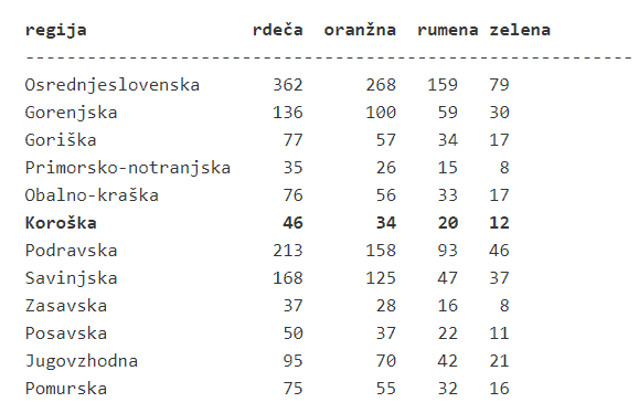 Glede na zadnje objavljene podatke, torej torkove, so na Koroškem v zadnjih sedmih dneh zabeležili 59 novih okužb s koronavirusom. Sedemdnevno povprečje v regiji znaša 8,42. To pomeni, da Koroška glede na vladni semafor izpolnjuje pogoje za zeleno fazo, kako bo odločila vlada, pa bo znano danes. V Splošni bolnišnici Slovenj Gradec se po zadnjih podatkih Covid-19 sledilnika zdravijo 4 covidni bolniki, eden na oddelku intenzivne terapije.