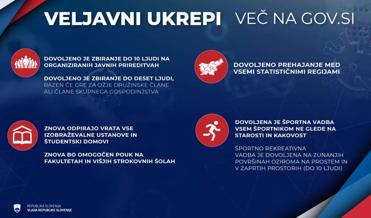 - Dovoljeno je zbiranje do 10 ljudi na organiziranih javnih prireditvah in javnih shodih (pod pogoji, ki jih določa Zakon o javnih zbiranjih).