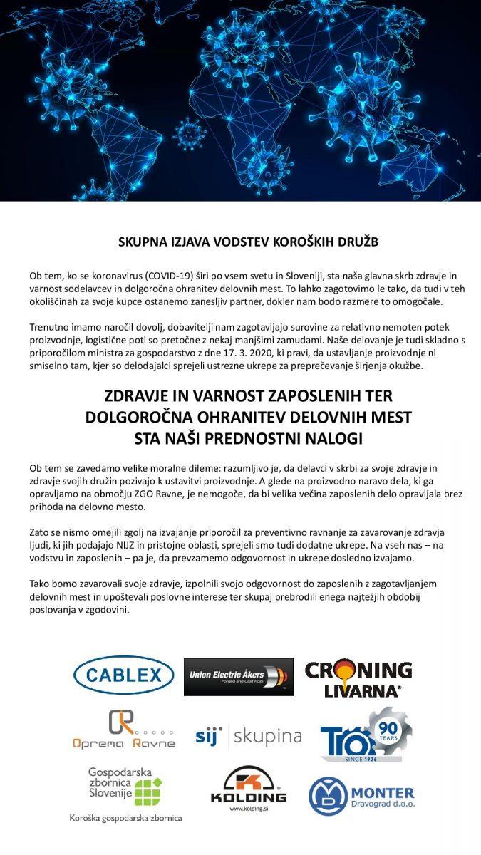 Ob tem se zavedamo velike moralne dileme: razumljivo je, da delavci v skrbi za svoje zdravje in zdravje svojih družin pozivajo k ustavitvi proizvodnje. A glede na proizvodno naravo dela, ki ga opravljamo na območju ZGO Ravne, je nemogoče, da bi velika večina zaposlenih delo opravljala brez prihoda na delovno mesto.
