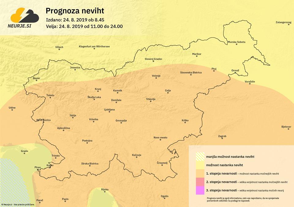 Obstaja možnost nastanka kakšne močnejše nevihte z močnejšimi, dolgotrajnejšimi nalivi in manjšo točo ali sodro. Največja verjetnost za nastanek močnejših neviht bo na Primorskem, Notranjskem in Dolenjskem, ni pa povsem izključena kakšna tudi drugod po državi. Ob morebitnem nastanku močnejših neviht je lokalno možen hiter porast hudourniških vodotokov.