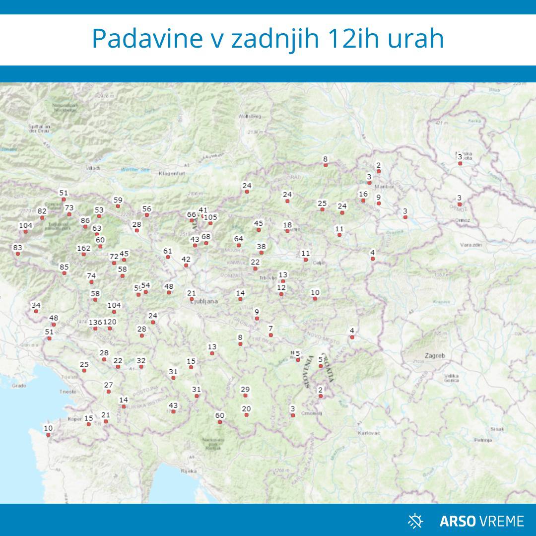 V zadnjih 12 urah je največ padavin padlo na Voglu - 162 l/m^2, Preko 100 l/m^2 je padlo še na Otlici, Kaninu, v Zadlogu, Idriji in v Logarski dolini. Najmanj padavin je zaenkrat padlo v skrajnem severovzhodnem in jugovzhodnem delu države.