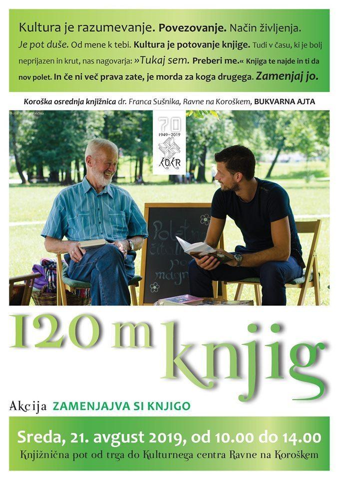 - 10.00 120 M KNJIG - Koroška osrednja knjižnica bo na Ravenskih dnevih sodelovala z akcijo Zamenjajva knjigo. Vsi obiskovalci prav lepo vabljeni, da s seboj prinesete knjigo, ki je doma morda ne potrebujete več in si želite, da najde nov dom. Nato si boste lahko na 120 m dolgi knjižni poti od Trga svobode do »kulturne plaže« pri Kulturnem centru izbrali novo. Če s seboj morda ne boste imeli knjige za zamenjavo, boste lahko kakšno kupili po simbolični ceni. Če bo izbire še vedno premalo, bo v tem času odprta tudi bukvarna. Vsi, ki si boste želeli, si boste lahko izdelali tudi kazalko (Trg-Kulturni center Ravne)
