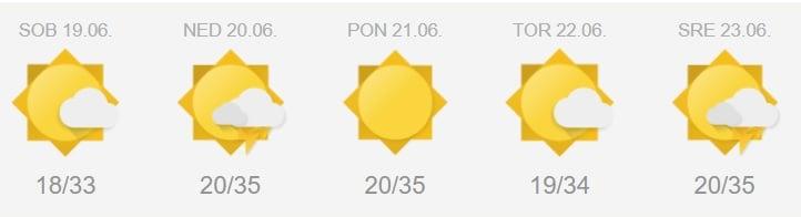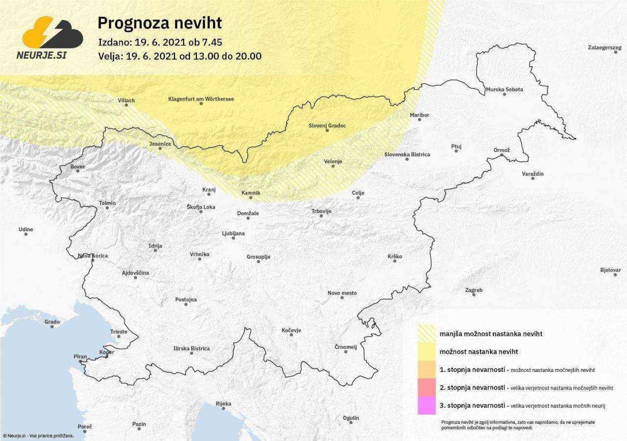 V soboto čez dan bo sončno in vroče. V večjem delu države bo suho. Nad Avstrijo bo nastalo nekaj krajevnih neviht. Kakšna lahko doseže tudi del severne Slovenije, predvsem območje Karavank, Kamniško-Savinjskih Alp, Koroške ali Pohorja. Ob morebitnem nastanku nevihte lahko le to spremlja močnejši naliv in manjša toča. Večjih posebnosti ni pričakovati.