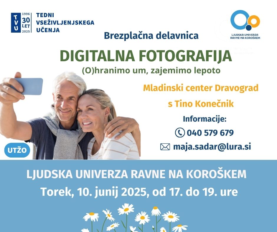Ljudska univerza Ravne na Koroškem vas vabi na brezplačno delavnico, na kateri boste skupaj naredili prve korake v svet digitalne fotografije. Spoznali boste osnovne funkcije pametnih telefonov, se naučili preprostih tehnik za boljše fotografiranje ter govorili o tem, kako ujeti zanimiv trenutek, lepo svetlobo ali čustvo v sliki.