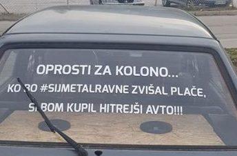 V teh dneh je moč na naših cestah opaziti tudi Golfa 2, mimo katerega nismo mogli niti mi. Pa ne zato, ker je Golf, temveč zaradi napisa na zadnjem vetrobranskem steklu. »Oprosti za kolono, ko bo SIJ METAL Ravne zvišal plače, si bom kupil hitrejši avto!«