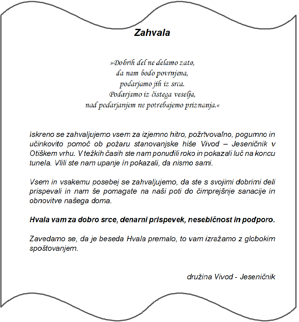"Iskreno se zahvaljujemo vsem za izjemno hitro, požrtvovalno, pogumno in učinkovito pomoč ob požaru stanovanjske hise Vivod - Jeseničnik v Otiškem vrhu. V težkih časih ste nam ponudili roko in pokazali luč na koncu tunela. Vlili ste nam upanje in pokazali, da nismo sami. Vsem in vsakemu posebej se zahvaljujemo, da ste s svojimi dobrimi deli prispevali in nam se pomagate na naši poti do čimprejšnje sanacije in obnovitve našega doma.