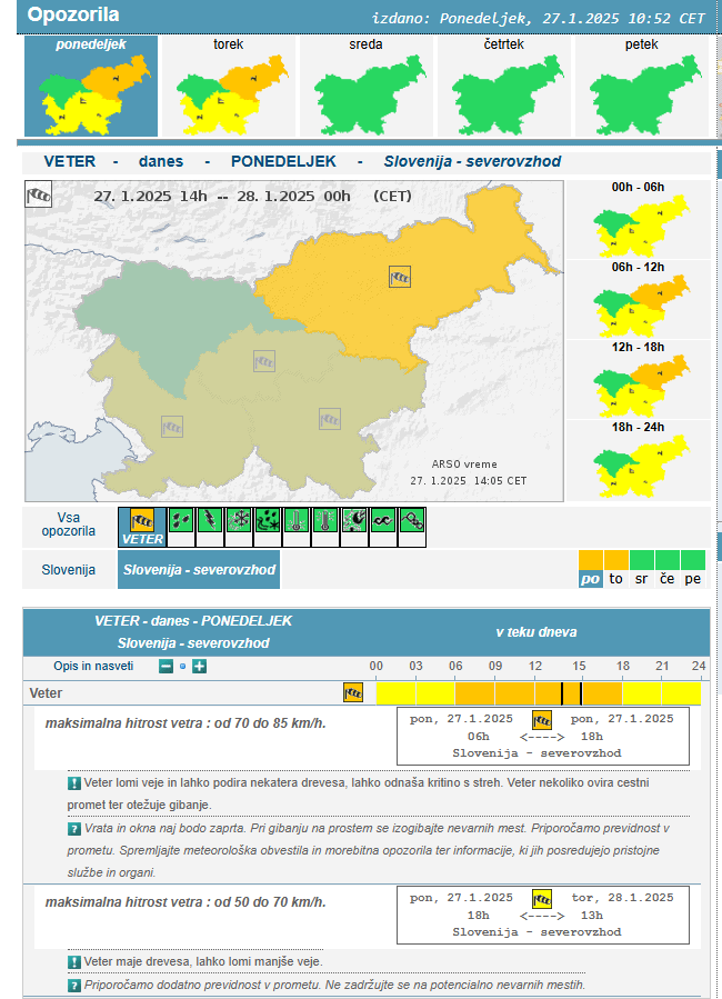 Danes bo v višjih legah in na severovzhodu zelo vetrovno. Sunki jugozahodnika bodo po nižinah severovzhodne Slovenije presegali hitrost 70 km/h.