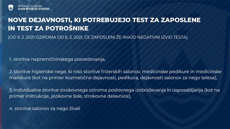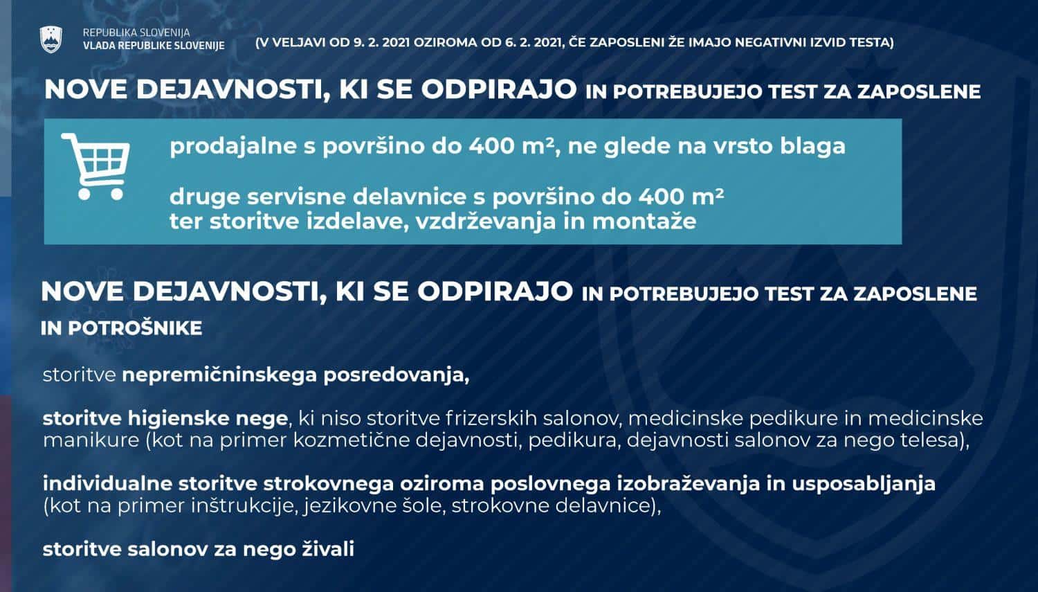 Za tiste trgovine in dejavnosti, ki lahko obratujejo že sedaj, bo testiranje zaposlenih potrebno od 12. februarja dalje, je še povedala Cuderman. Za tiste dejavnosti, ki se odpirajo na novo, pa bo testiranje obvezno že od sobote. Izjema so servisne delavnice za motorna vozila in kolesa, za katere odlok testiranja ne zahteva. "Testiranje morajo organizirati izvajalci sami," je poudarila.