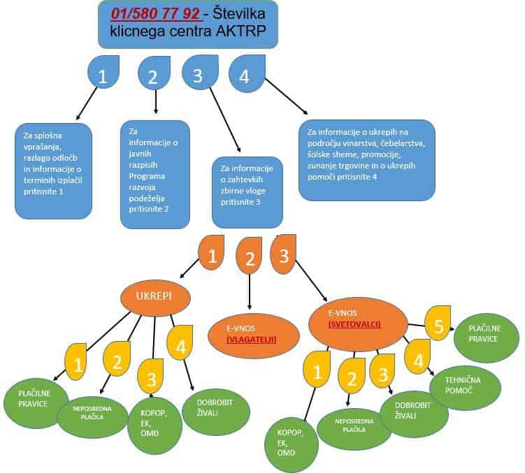 Ob klicu na osnovno telefonsko številko 01/580 77 92 boste s pomočjo odzivnika izbrali ustrezno linijo. V primeru splošnih vprašanj, razlag odločb in informacij o terminih izplačil, pritisnite številko 1. Če želite informacije o javnih razpisih programa razvoja podeželja, pritisnite številko 2. Če potrebujete pomoč pri zbirni vlogi, pritisnite številko 3. V primeru vprašanj o ukrepih na področju vinarstva, čebelarstva, šolske sheme, promocije, zunanje trgovine in o ukrepih pomoči, pritisnite številko 4.