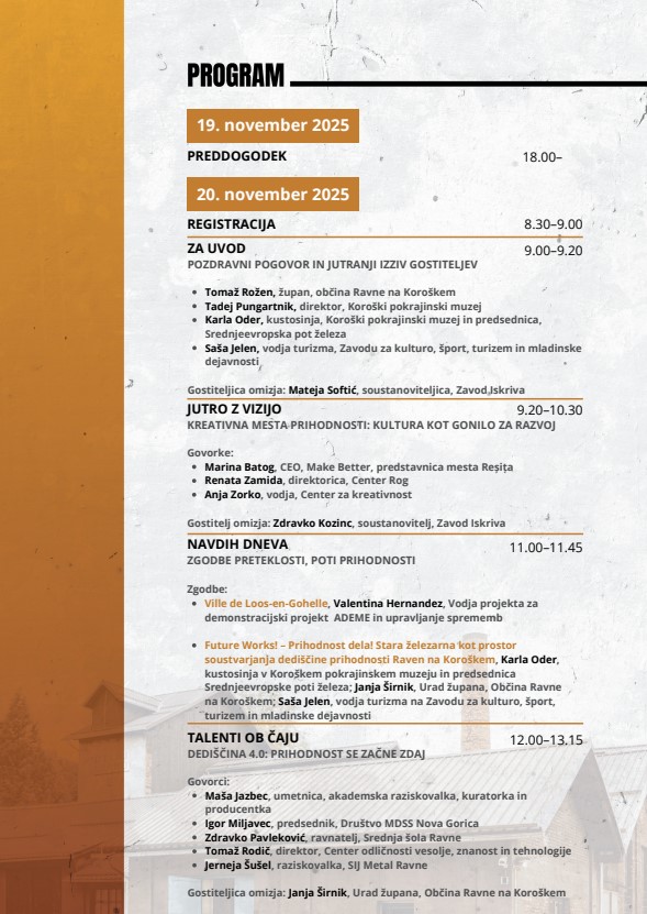 Razvojna konferenca Soustvarjanje dediščine prihodnosti: Utrip industrijske preteklosti, vizija prihodnosti, ki jo organizira Zavod Iskriva v sodelovanju z Občino Ravne na Koroškem, Koroškim pokrajinskim muzejem, Srednjeevropsko potjo železa, ZKŠTM in Geodetskim inštitutom Slovenije, bo naslovil, kako lahko industrijska dediščina postane gonilo vključujočega, trajnostnega in gospodarskega razvoja mest ter družbe prihodnosti.