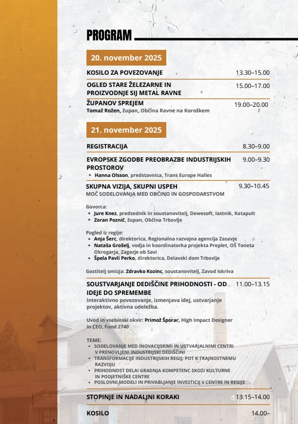 Na razvojni konferenci, ki bo potekala med 20. in 21. novembrom 2025, v Stari železarni, bo združila vrhunske mednarodne govorce, ki s svojim delom postavljajo trende na področjih kulturne regeneracije, inovativnih ekonomij in trajnostnega razvoja.
