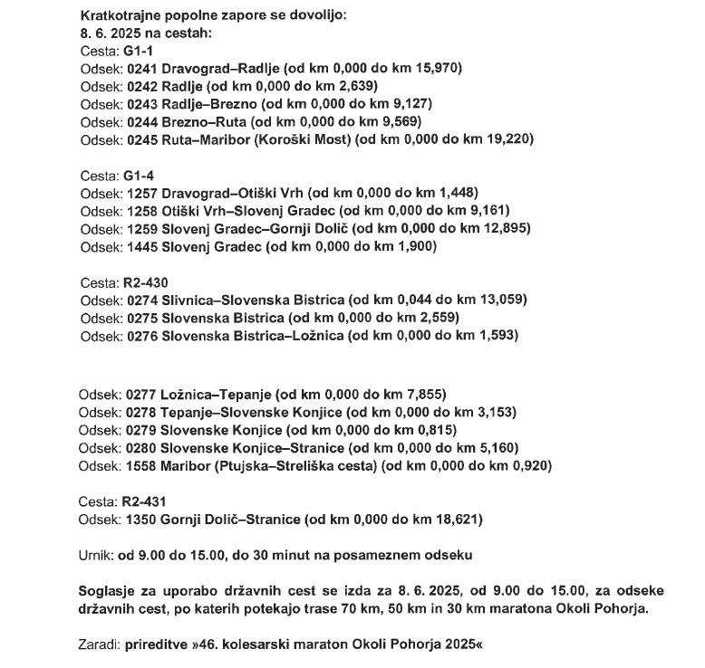 Zaradi prireditve ''46. kolesarski maraton Okoli Pohorja 2025'' bo prišlo v nedeljo do do kratkotrajnih popolnih zapor državne ceste, ki bodo izvedene z namenom zagotavljanja varnosti udeležencev maratona ter nemotenega poteka dogodka.