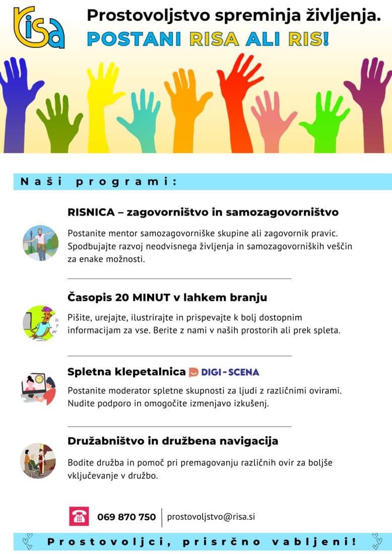 Vse njihove aktivnosti, programi in projekti, ki jih izvajajo brezplačno in s pomočjo zavzetih prostovoljcev, so koraki na poti do vključujoče in vsem dostopne družbe: brezplačen spletni časopis 20 minut v lahkem branju (Zavod Risa > Domov > Knjižnica > Časopis 20 minut), delavnice podajanja informacij v lahkem branju, zagovorništvo in samozagovorništvo za neodvisno življenje, bralne skupine, spletna klepetalnica za ljudi z oviranostmi DIGI-SCENA, družabništvo, osebna asistenca itd.