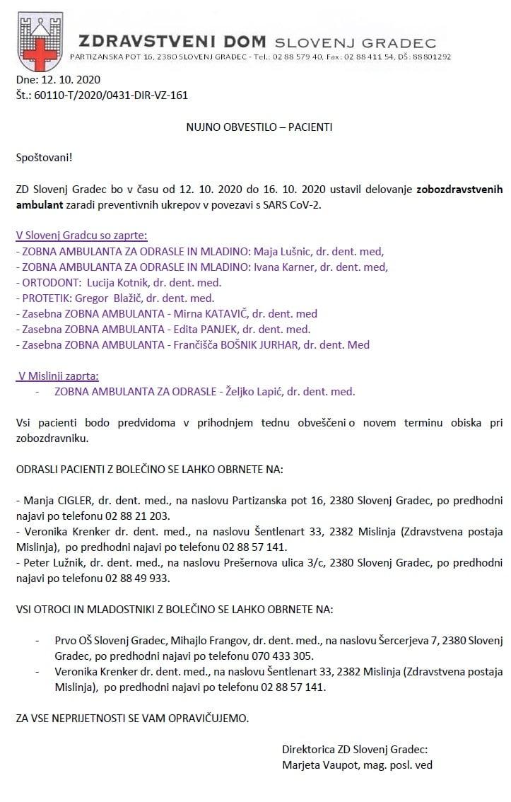 Kot so navedli v sporočilu za javnost, ki so ga objavili na njihovem Facebook profilu in spletni strani, bodo delovanje zobozdravstvenih ambulant ustavili med 12. 10 in 16. 10. 2020.