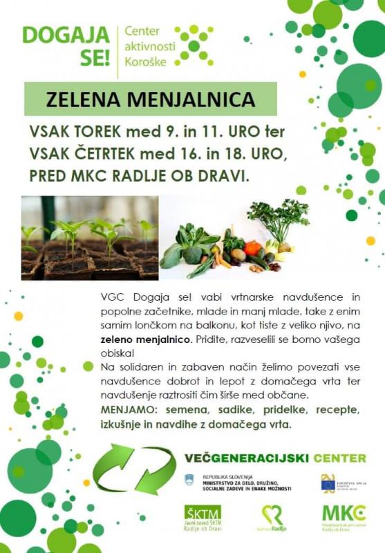 Na zeleno menjalnico ste vabljeni vsi vrtnarski navdušenci in tudi tisti, ki to še niste. Mladi, manj mladi, izkušeni ali začetniki ... Organizatorji želijo na solidaren in zabaven način povezati navdušence dobrot in lepot z domačega vrta.