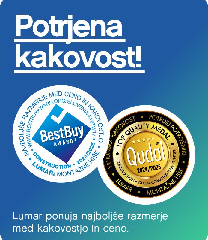 V današnjem času, ko smo obdani s številnimi izdelki potrošniške družbe, pogosto pozabimo, da je pri izbiri doma ključnega pomena zanesljiv, varen in kakovosten partner. Ta nas ne le celovito in skrbno vodi skozi vse faze gradnje, temveč tudi zagotavlja vrhunske storitve in podporo v času bivanja v hiši. Lumar je edini slovenski proizvajalec lesenih montažnih objektov, z neodvisnimi odličji BestBuy in Qudal, ki potrjujeta najboljše razmerje med kakovostjo in ceno.