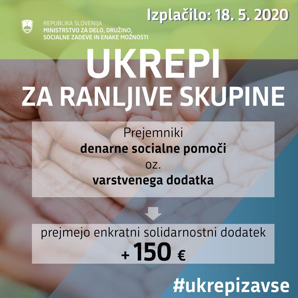 V ponedeljek, 18. maja 2020, bo tako izvedeno izplačilo enkratnega solidarnostnega dodatka v višini 150 evrov za prejemnike denarne socialne pomoči (DSP) oziroma prejemnike varstvenega dodatka (VD) za mesec april 2020.