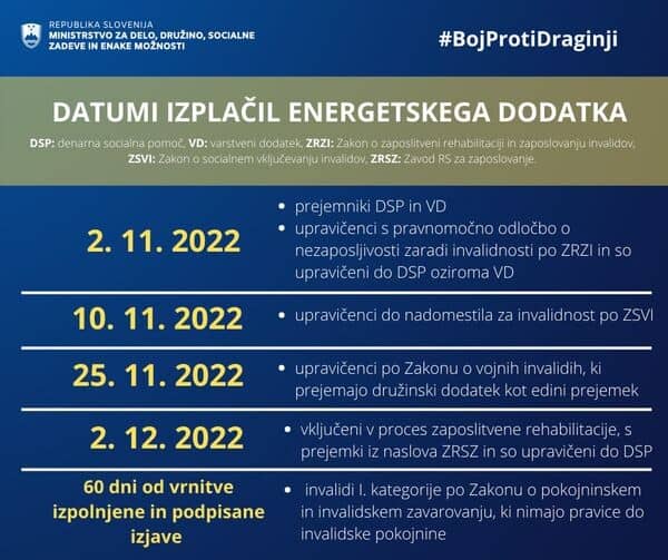 - upravičenci do nadomestila za invalidnost po Zakonu o socialnem vključevanju invalidov (ZSVI) bodo energetski dodatek prejeli 10. 11. 2022;