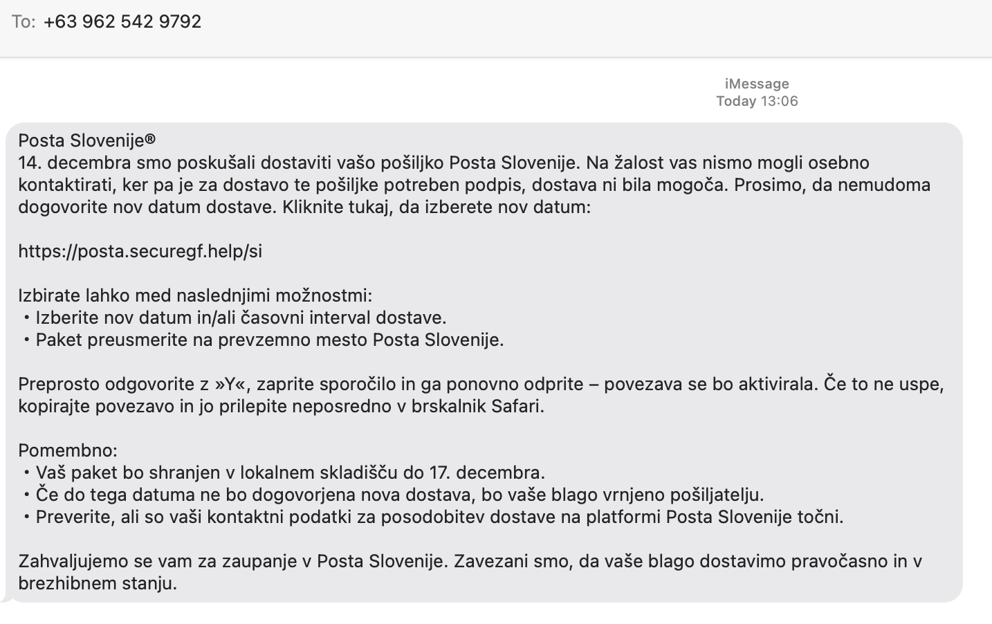 Sporočila so na prvi pogled videti verodostojna, uporabljajo uradno ime podjetja in prepričljiv jezik, njihov namen pa je zavajati prejemnike, da kliknejo na sumljivo povezavo in posredujejo osebne ali finančne podatke.