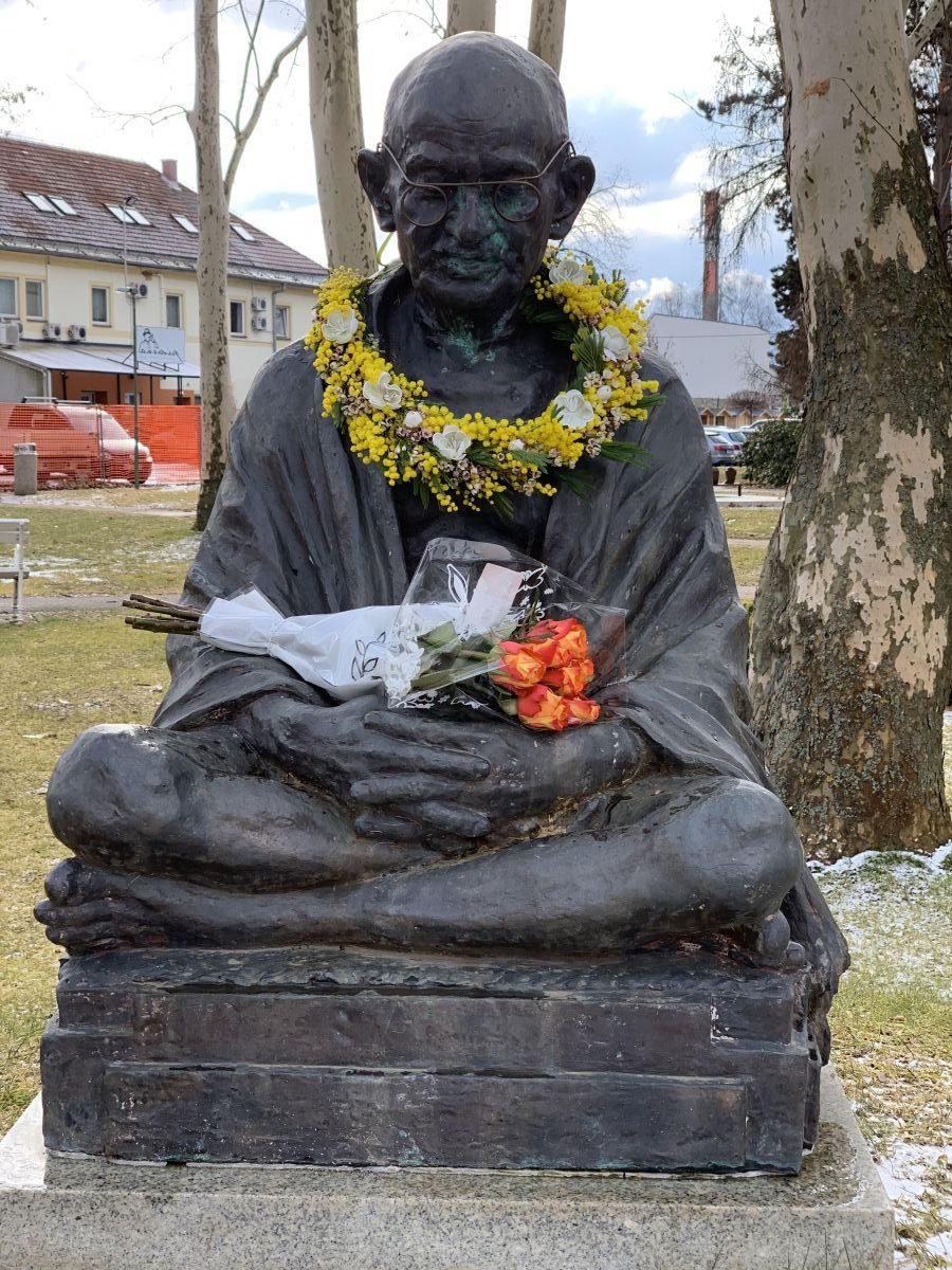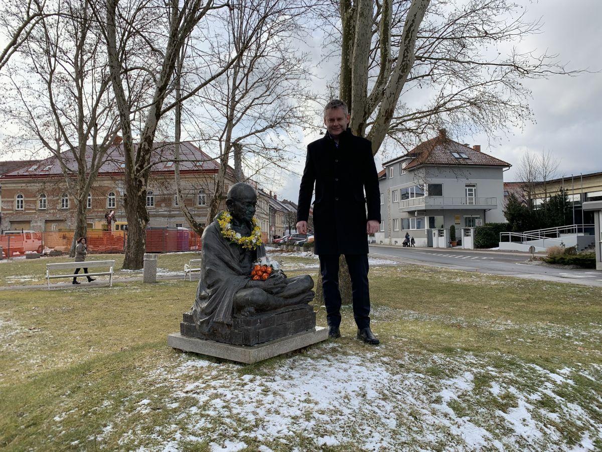 Kip je postavljen v parku na križišču Glavnega trga in Pohorske ceste. Spomenik nekdanjega indijskega voditelja in politika Mahatme Gandhija (1869-1948), ki ga je izdelal indijski kipar Ram V. Sutar, je darilo Indije oz. indijskega veleposlaništva Sloveniji. Kot je leta 2010 v Slovenj Gradcu dejal indijski veleposlanik v Sloveniji Jayakar Jerome, je veleposlaništvo ocenilo, da je Slovenj Gradec, ki nosi naziv ZN mesto glasnik miru, primeren kraj za postavitev spomenika borca za mir, ki je v resnici bil, kot je predstavljen tudi s kipom, preprost človek, ovit v preprosto oblačilo.