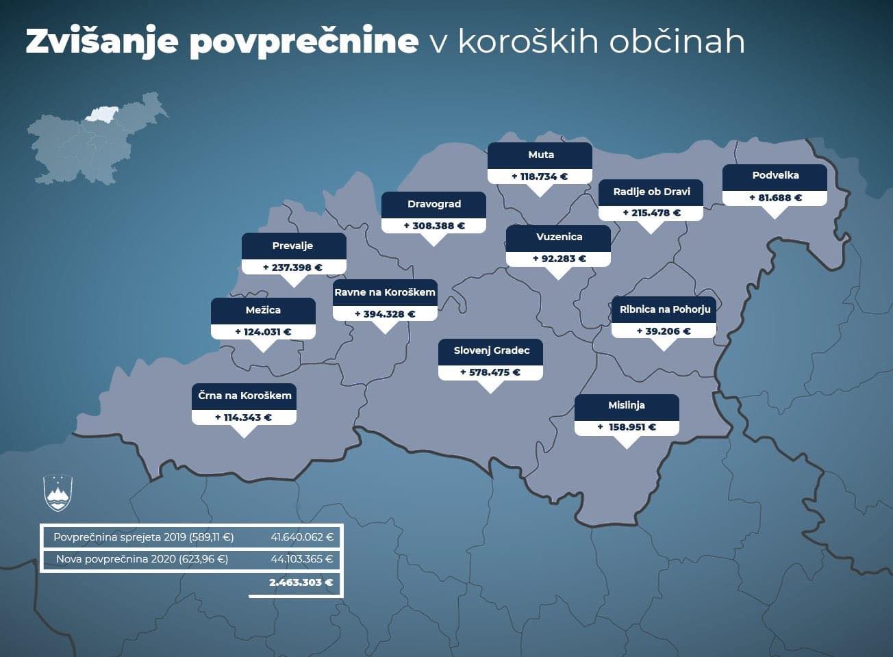 Občanke in občani Mute, Radelj ob Dravi, Podvelke, Vuzenice, Dravograda, Prevalj, Ribnice na Pohorju, Slovenj Gradca, Raven na Koroškem, Mežice, Črne na Koroškem in Mislinje bodo z izglasovano višjo povprečnino prejeli skupno 2.463.303 evrov več kot je bilo predvideno z višino povprečnine, izglasovane v letu 2019.