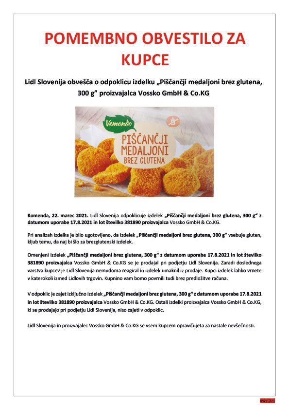Pri analizah izdelka je bilo ugotovljeno, da medaljoni vsebujejo gluten, kljub temu da naj bi šlo za brezglutenski izdelek. Lot oznaka izdelka je 381890 rok uporabe pa 17. avgust 2021.