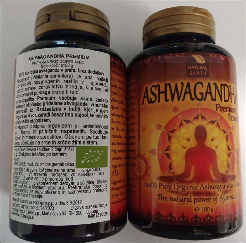 Tip/oznaka: Natural Earth Ashwagandha Premium powder, 100 g; Ashwagandha Premium; 100% ekološka ašvaganda v prahu brez dodatkov
