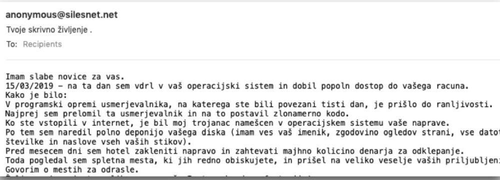 V zadnjem obdobju so policisti prejeli večje število obvestil občanov, da so prejeli elektronska sporočila neznanih oseb, ki od njih zahtevajo nakazilo denarnih sredstev v zameno za to, da ne bi razkrili obiskovanja spletnih strani s pornografskimi vsebinami, za katere neznani pošiljatelji trdijo, da so jih prejemniki obiskovali. So v četrtek, 12. junija, zapisali na spletni strani Policije.