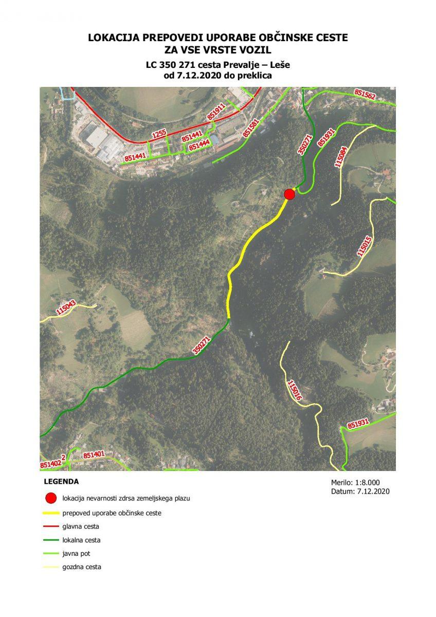 Prepoved uporabe občinske ceste za vse vrste vozil je posledica nevarnosti zdrsa zemeljskega plazu na lokaciji neposredno za Leško kapelico v smeri Leš.