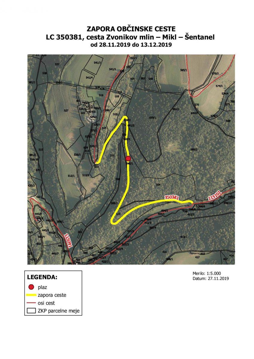 Občina Prevalje obvešča, da bo od 28. 11. 2019 do 13. 12. 2019 zaradi sanacije plazu delna in popolna zapora kategorizirane občinske ceste LC 350 381, cesta Zvonikov mlin - Mikl - Šentanel, in sicer od začetka novega asfalta do odcepa za kmetijo Zvonik.