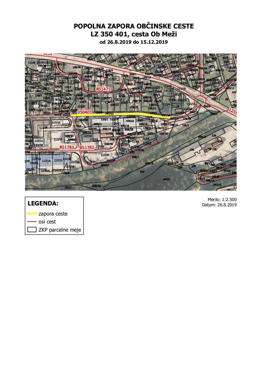 - Popolna zapora LZ 350 401, Ob Meži, v odseku 200 m, v smeri od poslovnega centra Center Meža, in sicer v terminu od 26. 8. 2019 do 15. 12. 2019.