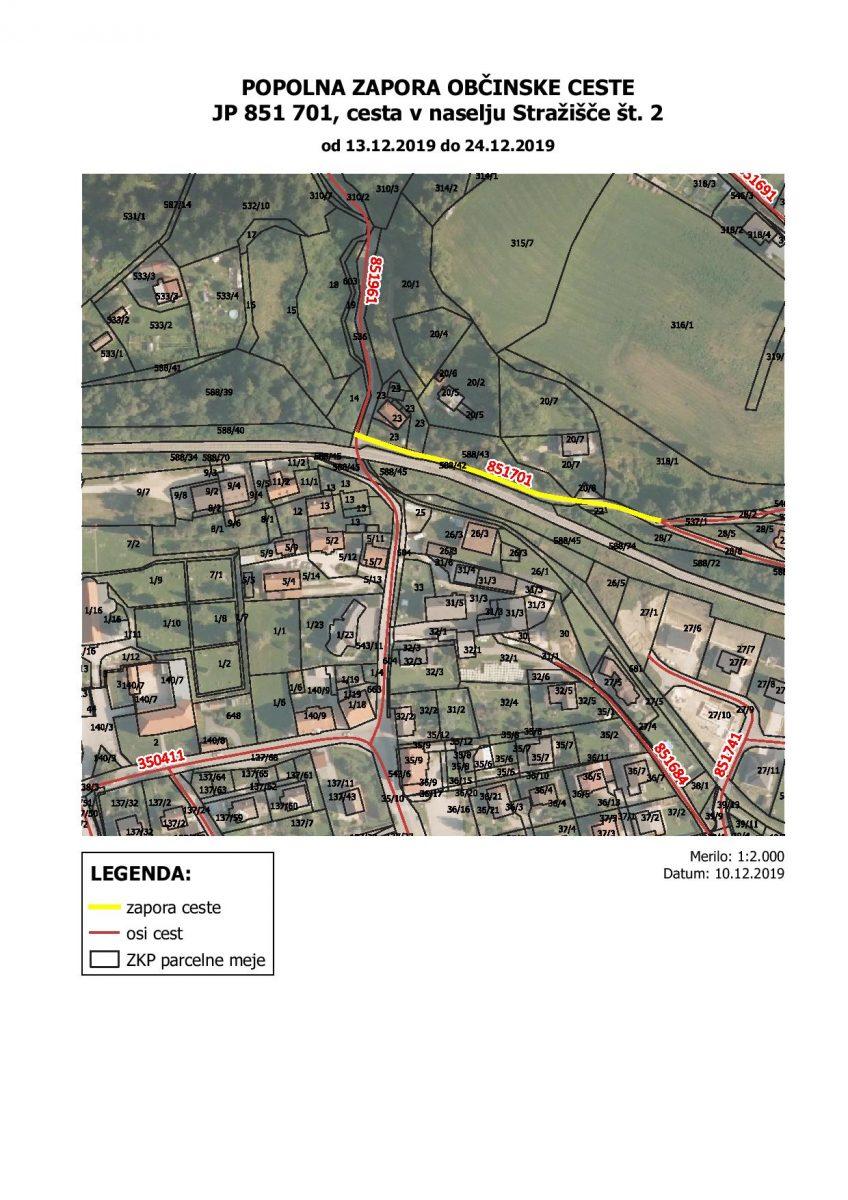 - Popolna zapora JP 851 701, cesta v naselju Stražišče št. 2, za viaduktom Na Fari desno v dolžini 150 m v terminu od 13. 12. 2019 do 24. 12. 2019.