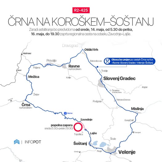 Kot so sporočili na portalu InfoPot, bo zaradi asfaltiranja predvidoma od srede, 14. maja, od 5.30 do petka, 16. maja, do 19.30 zaprta regionalna cesta na odseku Zavodnje–Lajše.